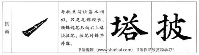 提是由左下斜向右上写出的笔画。左下逆锋人笔,顺势向下侧势顿笔,略轻提笔,挫锋后换中锋斜向右上提笔力行,至尾端迅速有力挑出,尖锐有力。写挑画时须取仰势,头要昂,腹要平挺,背要丰润,尾须呈扬势,使其雄头强尾。
