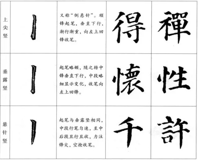 竖画根据收笔处形状的不同,分为“垂露”、“悬针”两大类。收笔处如露珠欲滴还留状的圆尾竖是“垂露竖”,形如衣针倒悬上粗下尖者为“悬针竖”。这两大类中还可分为左弧竖、右弧竖、悬胆竖等多种形态。