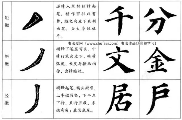 撇画须姿态舒展、坚实劲健。撇头要昂扬有精神,撇身须有适当弧度,撇尾应有上扬照应之势。撇画有多种写法,如平撇(也称短撇)、斜撇、竖撇等。