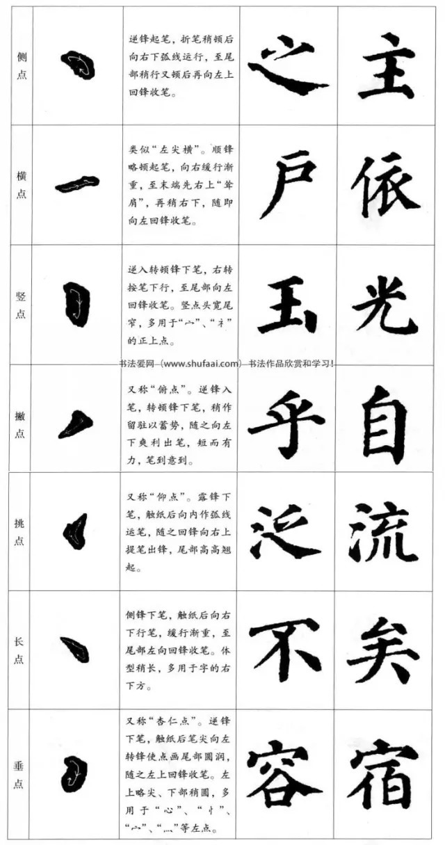 “点”的形态多种多样,要因姿取势、顾盼生动。“点”画有七种基本形态。