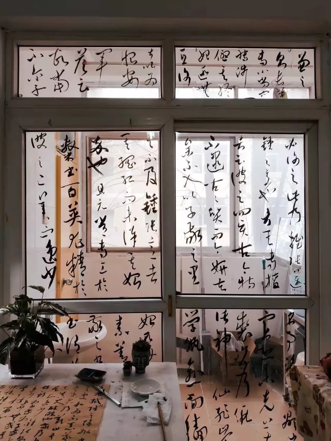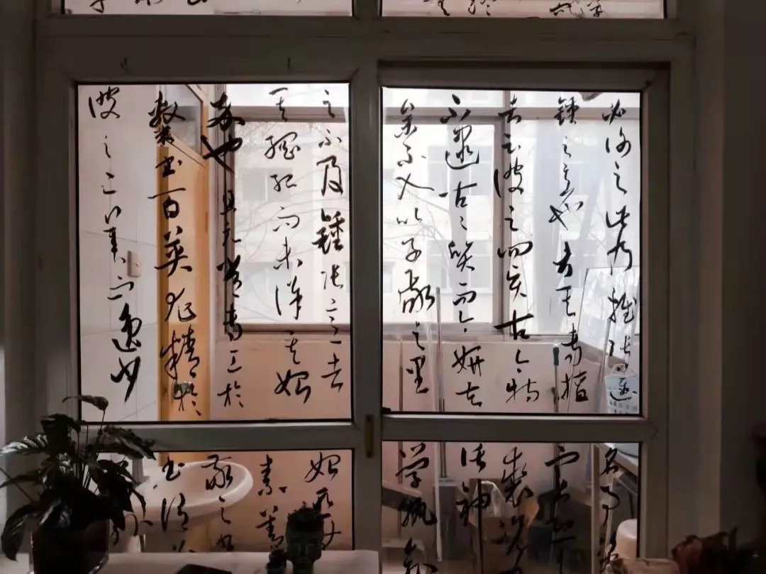 行云流水般狂放的字体,与窗外北方萧瑟寒凛的冬天相呼应,一扇普通的推拉门瞬间变成了古风屏风,自带韵意。