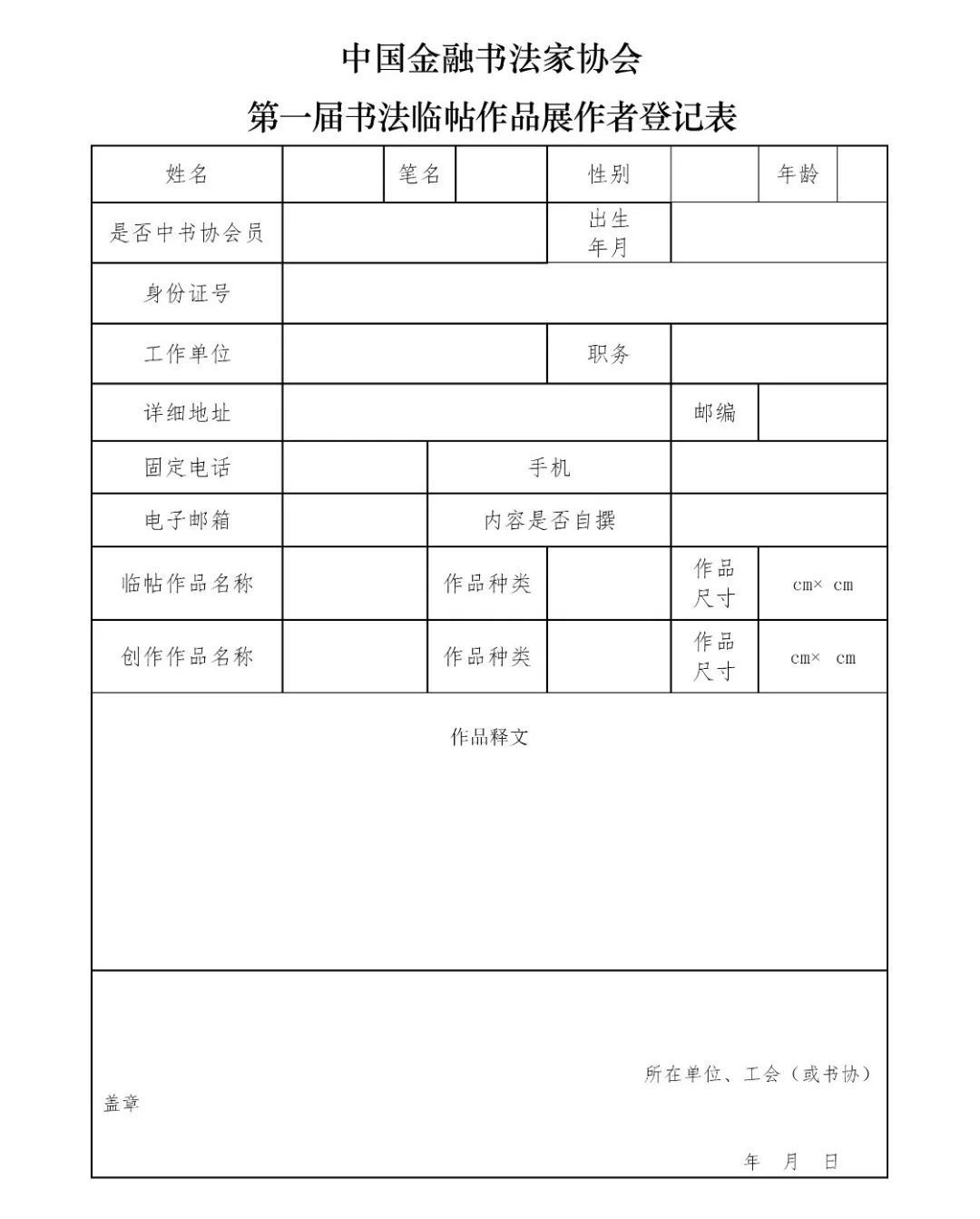 中国金融书法家协会 第一届书法临帖作品展 征稿启事 为深入学习贯彻党的十九届六中全会和习近平总书记在第十一届全国文代会上的重要讲话精神,大力弘扬中华民族优秀传统文化,引导金融系统广大书法家深入学习历代经典碑帖,推动金融书法创作水平,发掘更多优秀书法人才,推荐作品参加全国第三届书法临帖作品展览,中国金融书法家协会决定举办第一届书法临帖作品展。因受疫情影响,此次展览将以网络展形式举办,现将有关事项公布如下: 一 主办单位 中国金融书法家协会 二 组织机构 1.组委会 由中国金融文联、中国金融书法家协会的领导和专家组成。 2.评审委员会 由中国金融书法家协会组成评审委员会,负责评审工作。 三 征稿要求 1.征稿范围 金融系统从业人员及退休干部职工。 2.作品要求 (1)投稿作品仅限毛笔书法作品,书体不限,投稿作品包括临摹与创作各一件作品。投稿时附上所临碑帖名称及释文。本次展览不收篆刻作品。 (2)临帖作品。限定古代经典作品(清代以前,含清代),可根据实际需要选临或者通临,但要保持原碑帖内容表达的完整性,切勿重组或支离文本。 (3)创作作品。内容要追求真善美,传递正能量。鼓励自作诗文,内容健康向上。使用他人诗文,应注意使用权威版本。投稿作者须遵守相关法律规定,确保书写内容不存在著作权、名誉权等争议和纠纷。因书写内容等而产生的任何纠纷,均由投稿作者本人负责。 (4)临帖和创作作品均要保持文字内容相对连贯完整;创作作品风格须与所临经典碑帖相对应,保持明显的取法渊源关系,是对所临经典碑帖的学习、思考与升华。 (5)规格。尺寸为六尺整张以内竖式(高不超过180cm、宽不超过97cm)。手卷作品尺寸高度不超过35cm,长度不超过248cm。册页作品尺寸每页高、宽不超过40cm,页数不超过12页(手卷、册页作品入展数量不超过总数的百分之六)。所有作品请勿装裱(册页除外)。 3.投稿要求 (1)作品照片清晰,照片格式统一为JPG,照片大小1MB—5MB。册页手卷作品提交局部照片即可,小字(字径小于2cm)作品附局部照片。提交作品要注明临摹或创作。 (2)为便于准确登记,及时联系作者,请认真填写《中国金融书法家协会第一届书法临帖作品展投稿登记表》,随作品照片一并发送邮箱。参加终评作者需寄送原作,应在原作的右下角注明作者姓名、单位、身份证号码,以及寄送详细地址、联系电话。 4.书写材料 为便于评审、装裱和展示,投稿作品应选择高质量专业书画用纸,避免使用易折断、破损的纸张。本次展览不接收非纸张类材料书写的作品(绢类除外)。 四 评审及奖项设置 1.初评:从全部投稿电子稿件中评选入选作者100人(每人两件,临作1件,创作1件),组委会通知作者寄送作品原件。 2.终评:从100人作品原作中选出80名入展作者,从入展作者中再选出30名优秀作者。 3.由中国金融书法家协会制定评审细则、评审流程、评审守则以及违规处理办法,并组织评审。 4.本次展览不收参展费,入选、入展、优秀作品一律不退稿,作者投稿被视同认可本办法。 五 作品报送 个人按征稿要求自行发送电子稿件到指定邮箱,杜绝重复投稿。 六 网路展览 网络展览展出优秀及入展作品。 七 作者待遇 1、向优秀作者、入展作者颁发证书。 2、非中国金融书协会员的优秀作者、入展作者,具备加入中国金融书法家协会的条件。 3、本届展览的入选作者作品,将由中国金融书法家协会集体推荐参评由中国书法家协会举办的第三届全国临帖展。 八 征稿日期 本启事自公布之日起征稿,至2022年5月31日截止,逾期投稿、作品不符合尺寸、版式、纸张要求,原作基本信息不全等,取消评选资格。 九 收稿邮箱 cg17710039770@163.com 联系人:陈刚 联系电话:010—85107525 十 其它事项 1.为维护临帖展的严肃性和权威性,金融书协将加大对代笔及一稿多投等违规行为的查处力度,举报长期有效。 2.所有来稿必须符合本启事要求。 3.凡投稿者视为认同并遵守本启事各项要求。 4.本征稿启事解释权归中国金融书法家协会办公室。 中国金融书法家协会 2022年3月17日