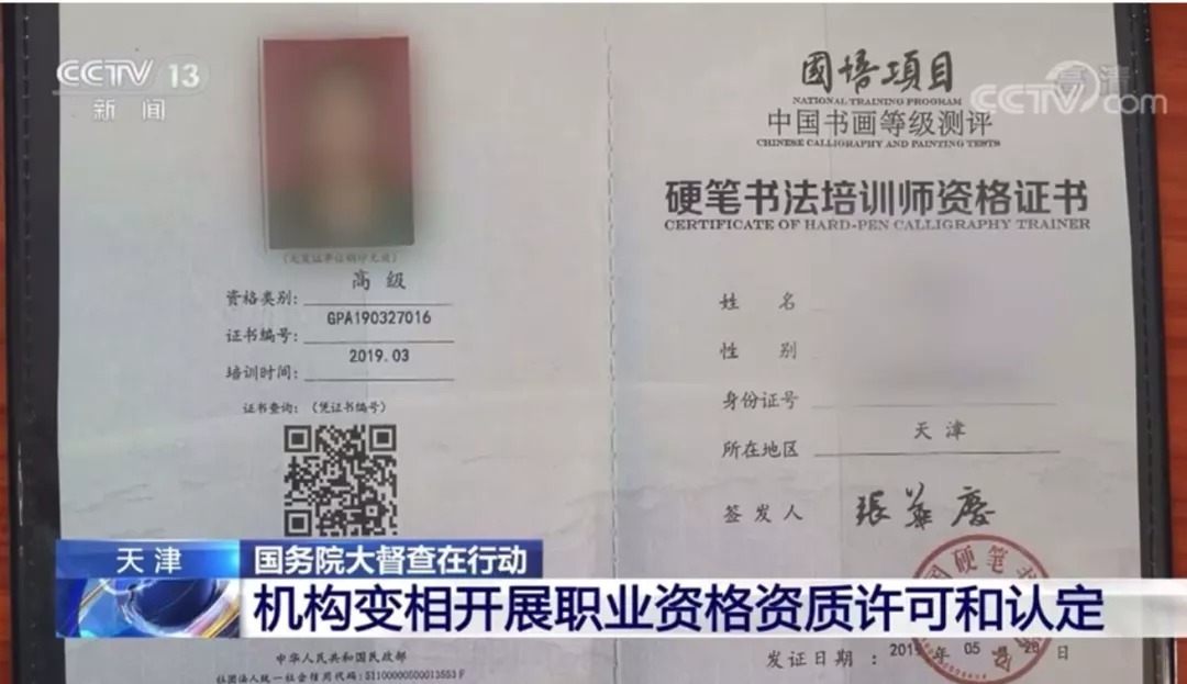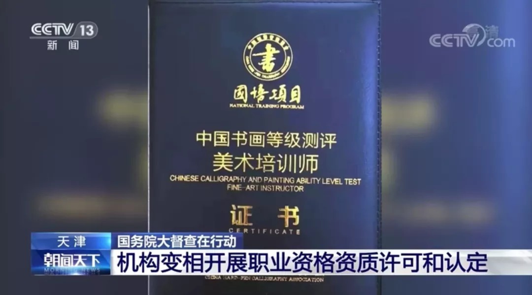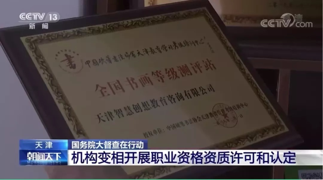 近日,国务院第八次大督查第二督查组在天津督促查处了一个违规开展资格资质许可和认定的机构。督察组对自称“中国硬笔书法协会天津办事处工委”的机构进行明查暗访后,发现其不仅违规组织考试,还违规发放硬笔书法培训师、美术培训师等资格证书。 《朝闻天下》“国务院大督查在行动”截图