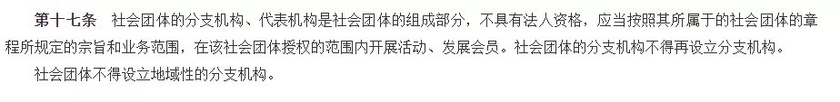在《社会团体登记管理条例》(1998年10月25日中华人民共和国国务院令第250号发布根据2016年2月6日《国务院关于修改部分行政法规的决定》修订)的第三章第十七条中明确规定:社会团体的分支机构、代表机构是社会团体的组成部分,不具有法人资格,应当按照其所属于的社会团体的章程所规定的宗旨和业务范围,在该社会团体授权的范围内开展活动、发展会员。社会团体的分支机构不得再设立分支机构。