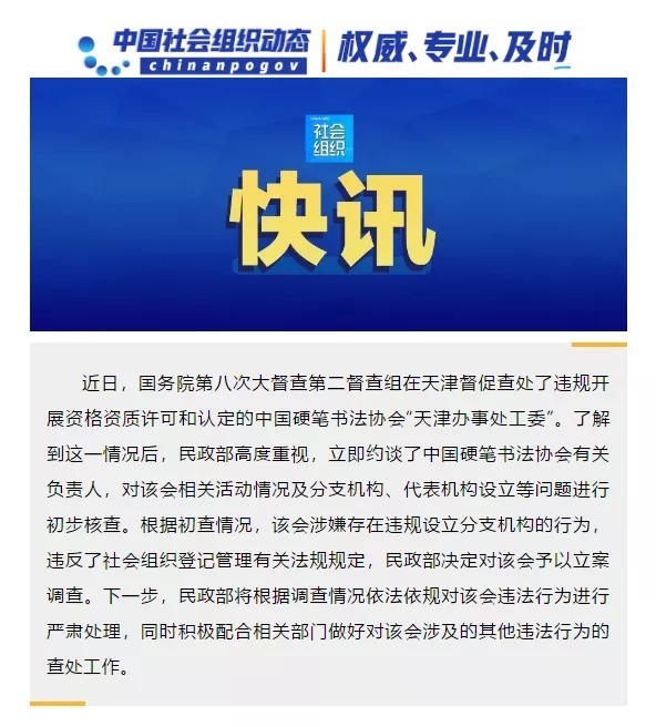 近日,国务院第八次大督查第二督查组在天津督促查处了违规开展资格资质许可和认定的中国硬笔书法协会“天津办事处工委”。了解到这一情况后,民政部高度重视,立即约谈了中国硬笔书法协会有关负责人,对该会相关活动情况及分支机构、代表机构设立等问题进行初步核查。根据初查情况,该会涉嫌存在违规设立分支机构的行为,违反了社会组织登记管理有关法规规定,民政部决定对该会予以立案调查。下一步,民政部将根据调查情况依法依规对该会违法行为进行严肃处理,同时积极配合相关部门做好对该会涉及的其他违法行为的查处工作。