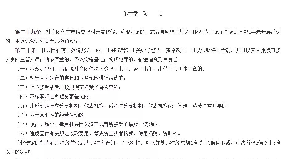 根据《社会团体登记管理条例》,第六章罚则第三十条: