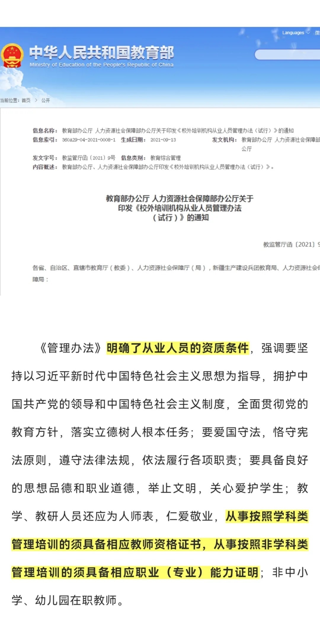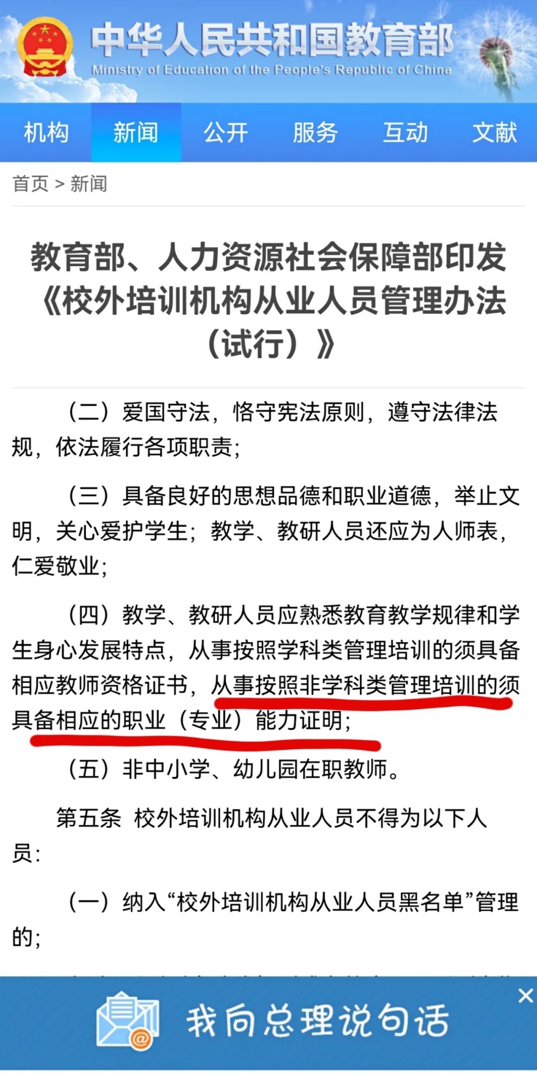 1.教育部、人社部《校外培训机构从业人员管理办法(试行)》文件中指出“从事按照非学科类管理培训的须具备相应职业(专业)能力证明”。