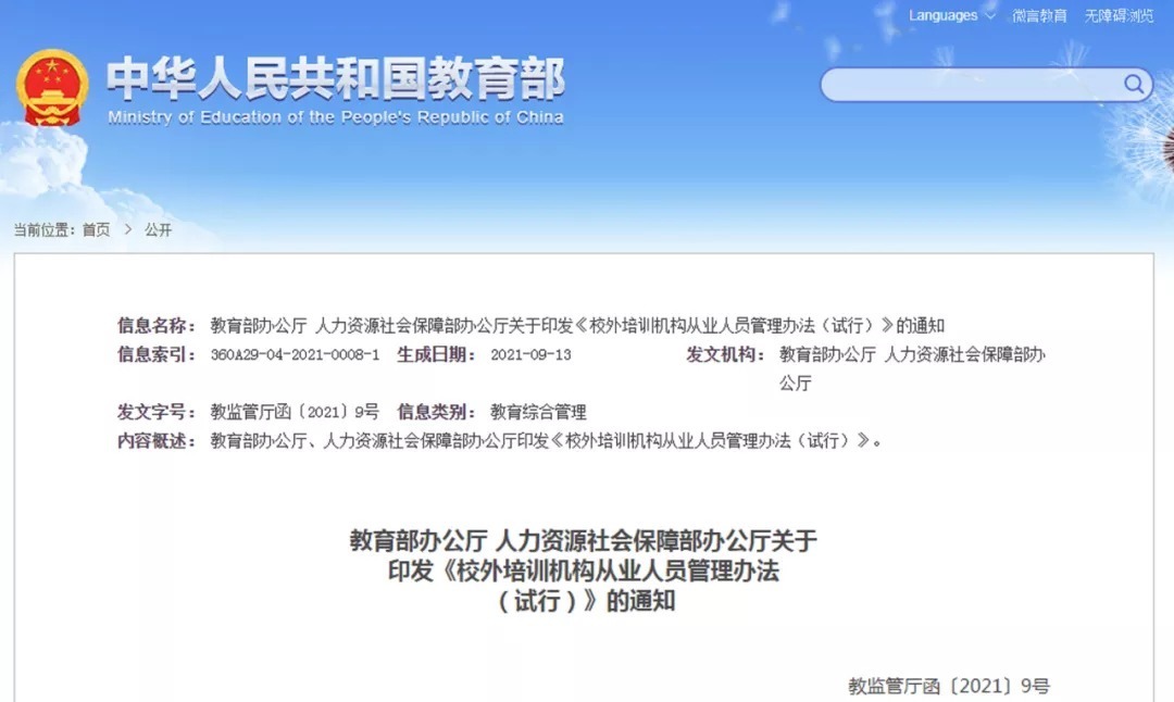 14日,教育部办公厅、人力资源社会保障部办公厅联合印发了《校外培训机构从业人员管理办法(试行)》(以下简称《管理办法》)。出台《管理办法》是贯彻落实中共中央办公厅、国务院办公厅印发的《关于进一步减轻义务教育阶段学生作业负担和校外培训负担的意见》精神的重要举措,将进一步加强校外培训机构从业人员管理,提升行业治理能力和治理水平,保障“双减”改革任务落实。